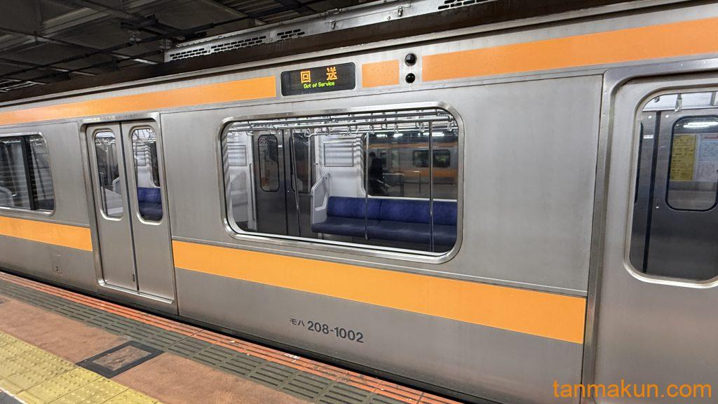 ホーム上に停車する209系。回送表示がされています。